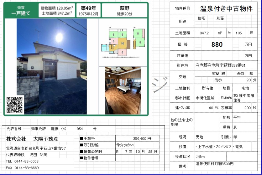【建物No1】白老町字竹浦181番地(中古住宅、温泉付き)